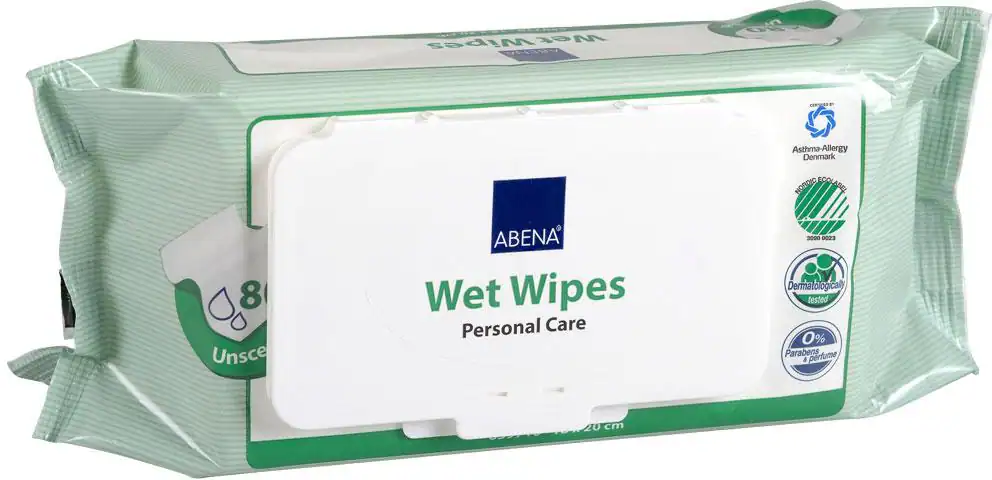 Υγρά μαντηλάκια μίας χρήσης της Abena με ευχάριστα καθαριστικό και ενυδατικό αποτέλεσμα. Κατασκευάζονται σε μια πολύ απαλή ποιότητα, η οποία είναι απαλή στο δέρμα. Αποτελούν μια καλή εναλλακτική λύση στον παραδοσιακό τρόπο πλύσης με νερό και σαπούνι.