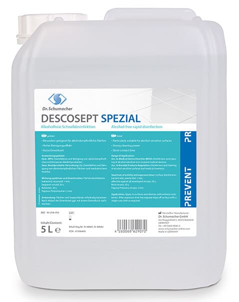 Το Descosept spezial είναι ένα έτοιμο προς χρήση διάλυμα, χωρίς αλκοόλες, κατάλληλο για τον καθαρισμό και την απολύμανση ευαίσθητου ιατρικού εξοπλισμού και επιφανειών, όπως οθόνες, θερμοκοιτίδες, μόνιτορ κτλ.